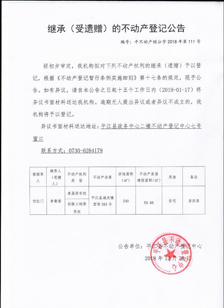 李菊香继承(受遗赠)的不动产登记公告平不动产继公字2018年第111号