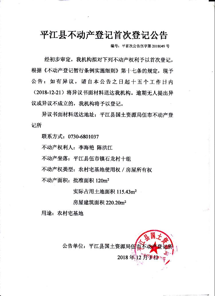 李海艳 陈洪江不动产登记首次登记公告伍字第2018049