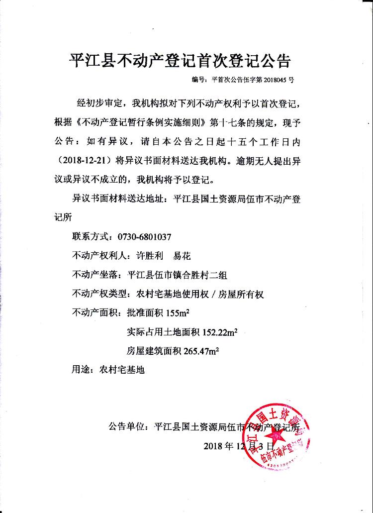 许胜利 易花不动产登记首次登记公告伍字第2018045