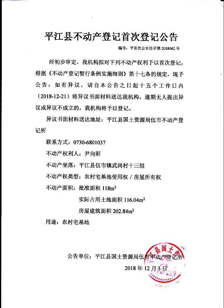 尹向阳不动产登记首次登记公告伍字第2018042