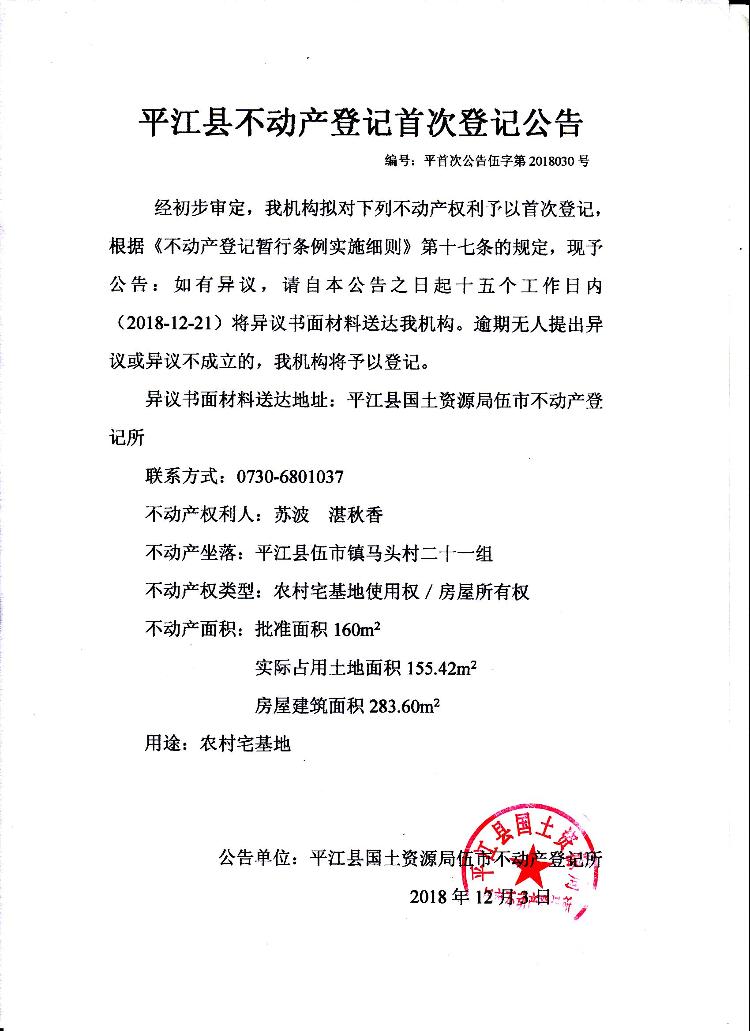 苏波 湛秋香不动产登记首次登记公告伍字第2018030