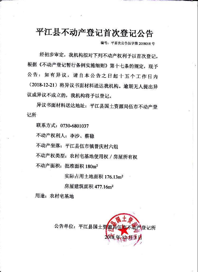李沙 蔡稳不动产登记首次登记公告伍字第2018018