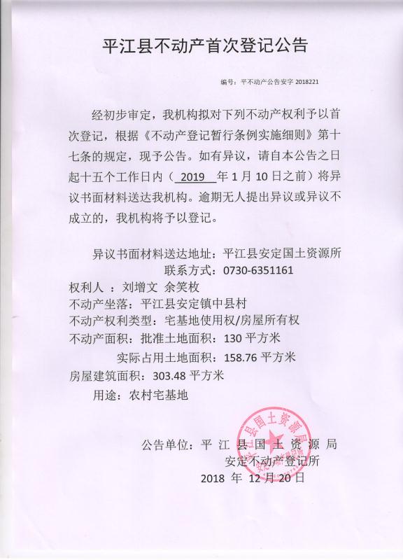刘增文 余笑枚不动产首次登记公告 安字2018221