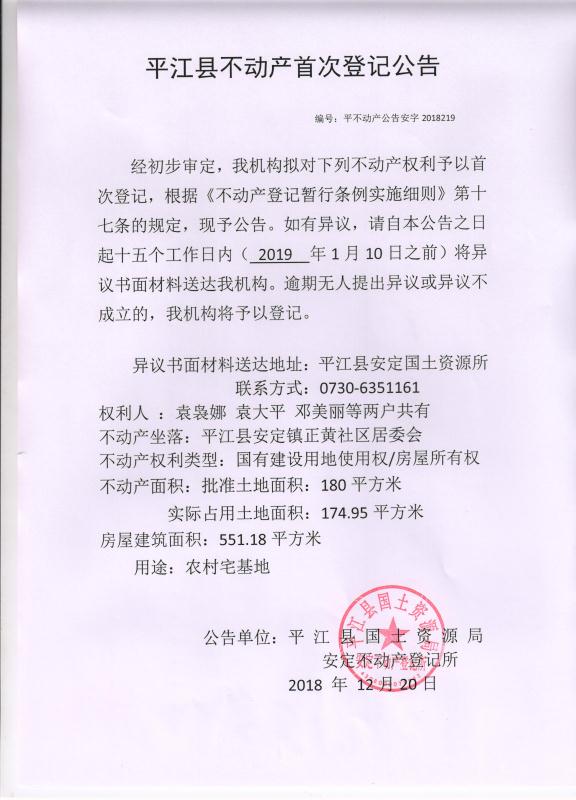 袁袅娜 袁大平 邓美丽两户共有不动产首次登记公告 安字2018219