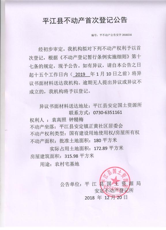 袁高照 钟糙梅不动产首次登记公告 安字2018216