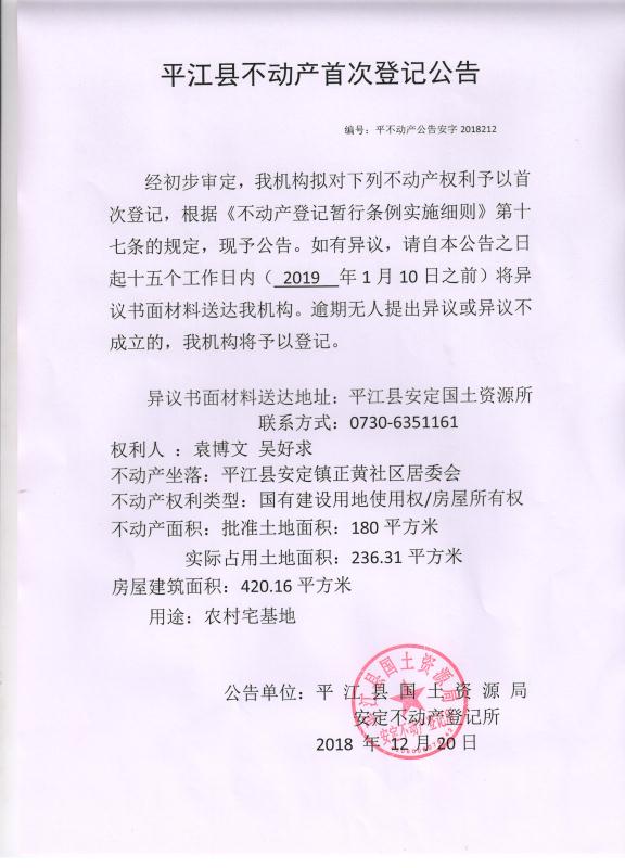 袁博文 吴好求不动产首次登记公告 安字2018212