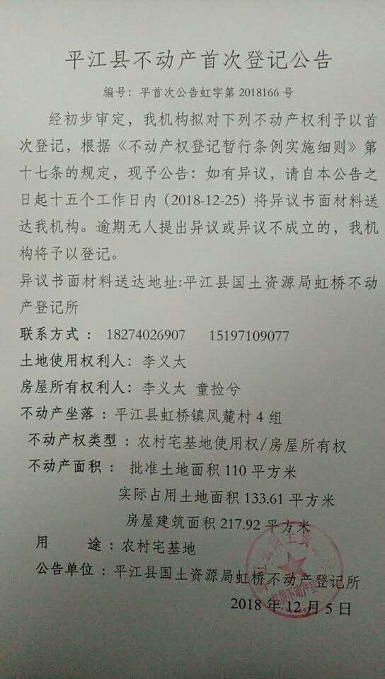 李义太 童捡兮不动产首次登记公告 虹字第2018166号