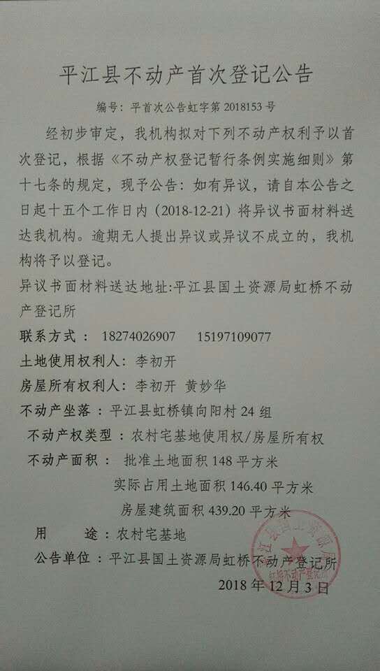 李初开 黄妙华不动产首次登记公告 虹字第2018153号