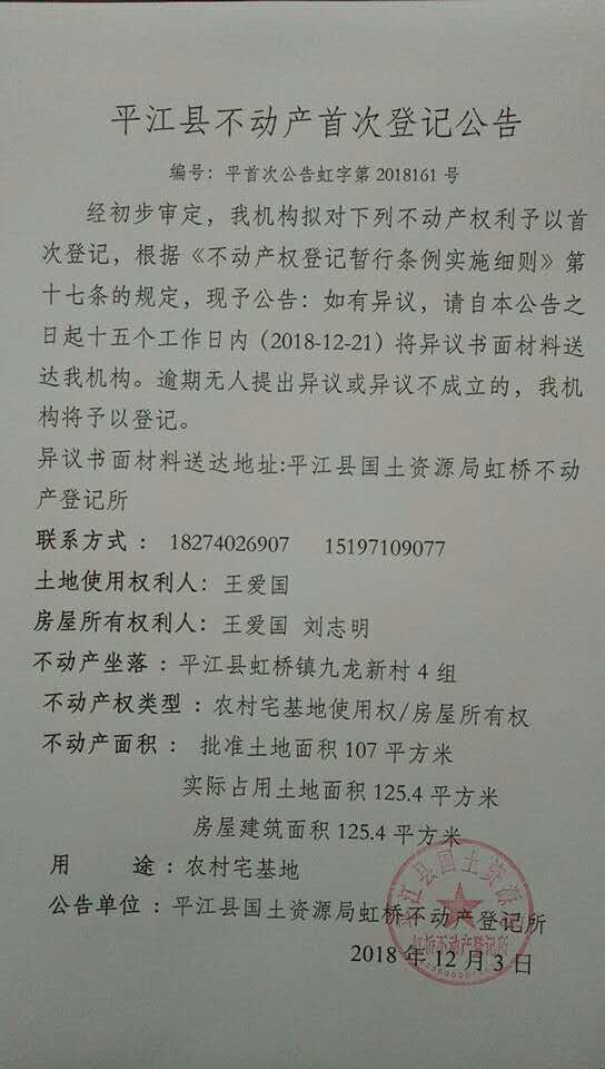 王爱国 刘志明不动产首次登记公告 虹字第2018161号