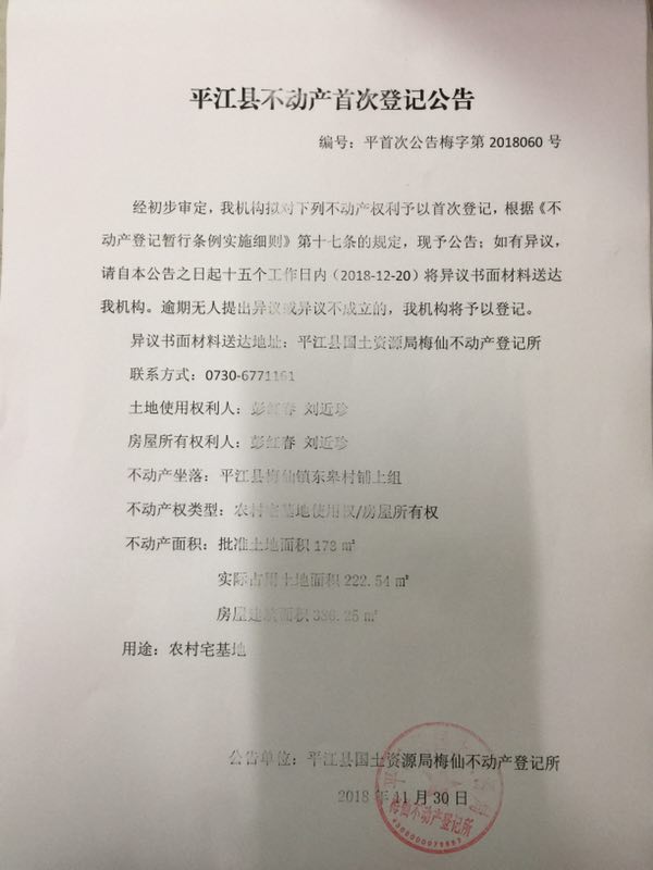 彭红春 刘近珍不动产首次登记公告 梅字第2018060号