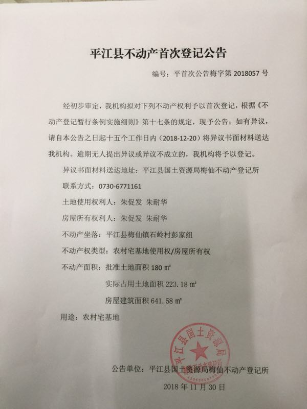 朱促发 朱耐华不动产首次登记公告 梅字第2018057号