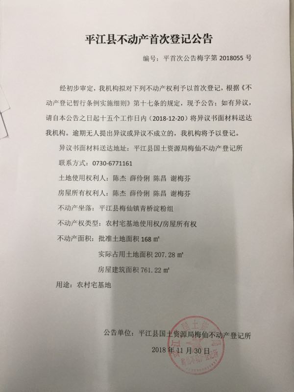 陈杰 薛伶俐 陈昌 谢梅芬不动产首次登记公告 梅字第2018055号