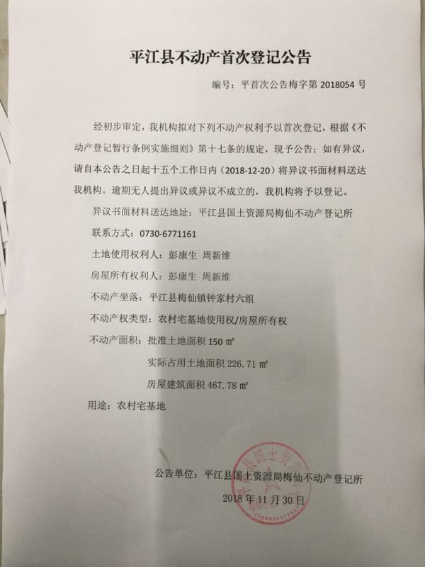 彭康生 周新维不动产首次登记公告 梅字第2018054号