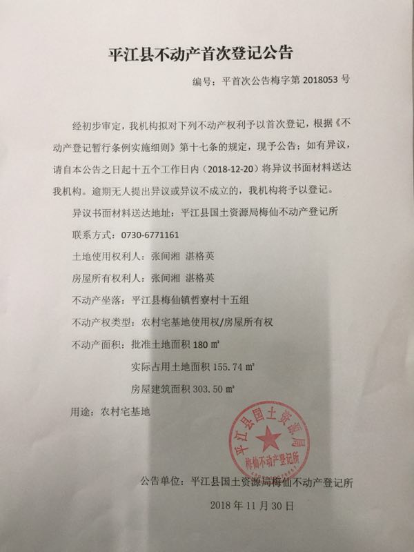张间湘 湛格英不动产首次登记公告 梅字第2018053号