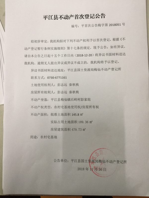 彭志远 秦秋桃不动产首次登记公告 梅字第2018051号