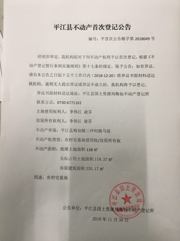 李伟江 凌芬不动产首次登记公告 梅字第2018049号
