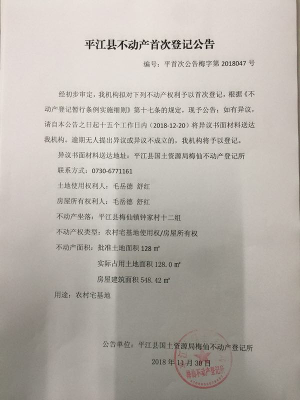 毛岳德 舒红不动产首次登记公告 梅字第2018047号