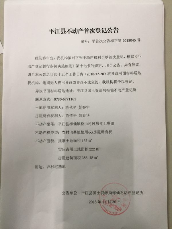 陈依平 彭春华不动产首次登记公告 梅字第2018045号