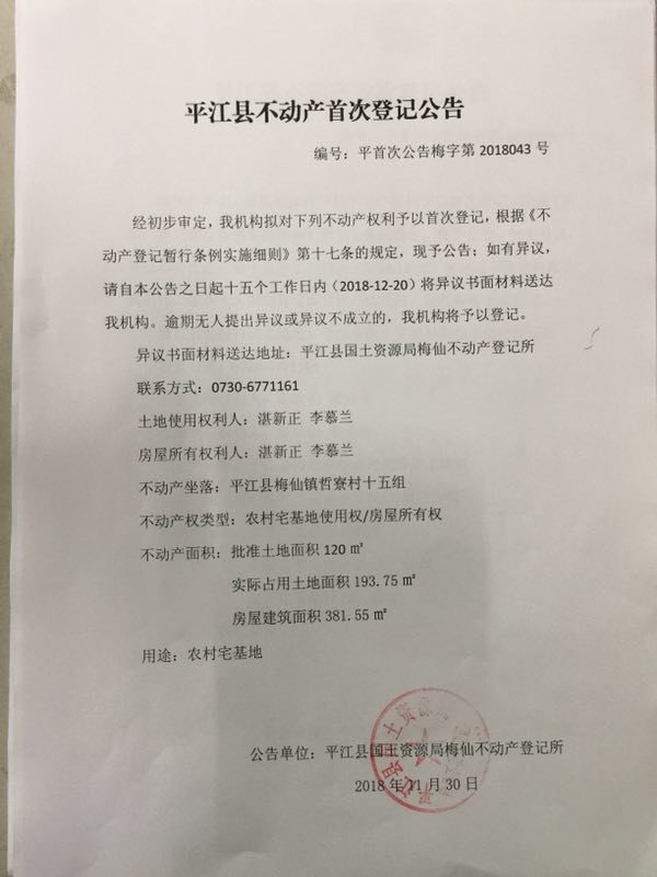 湛新正 李慕兰不动产首次登记公告 梅字第2018043号