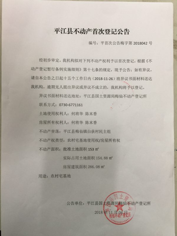 何将华 陈末香不动产首次登记公告 梅字第2018042号