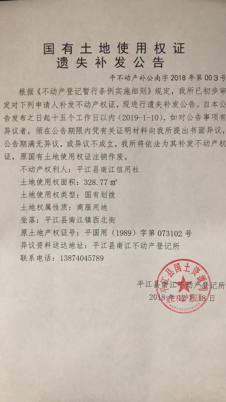 平江县南江信用社国有土地使用权证遗失补发公告平不动产补公南字2018年第003号
