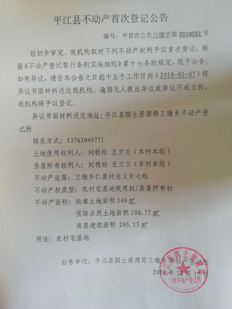 刘稳松 王兰兰不动产首次登记公告 三墩字第2018032号