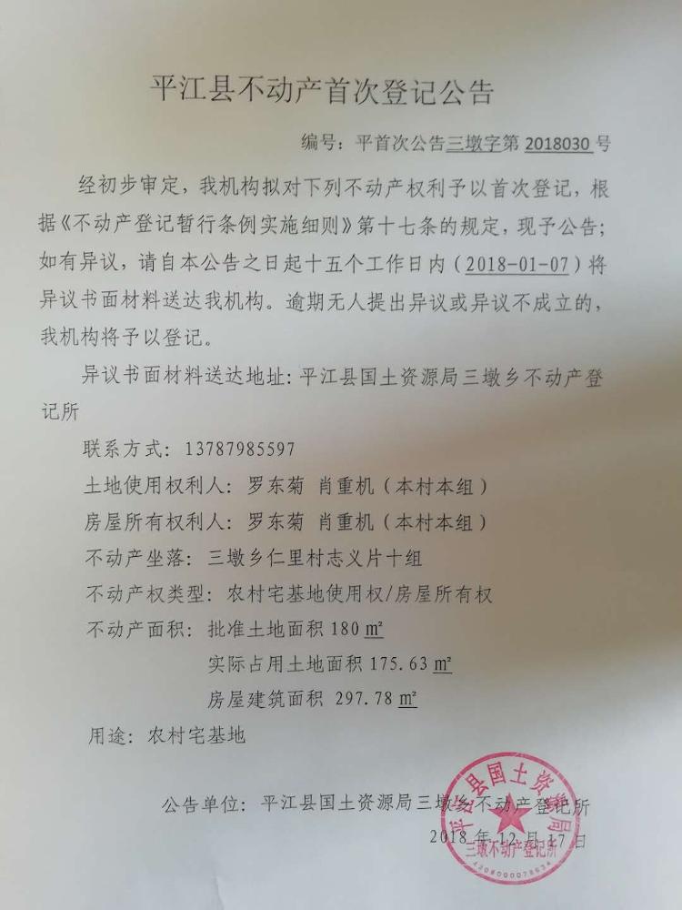 罗东菊 肖重机不动产首次登记公告 三墩字第2018030号