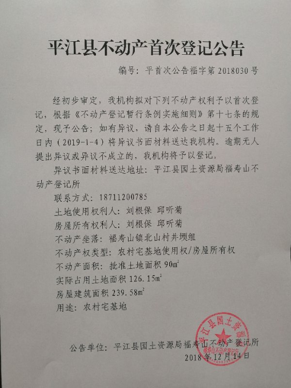 李根保 邱听菊不动产首次登记公告 福字第2018030号