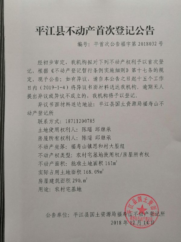 陈瑶 邱继承不动产首次登记公告 福字第2018032号