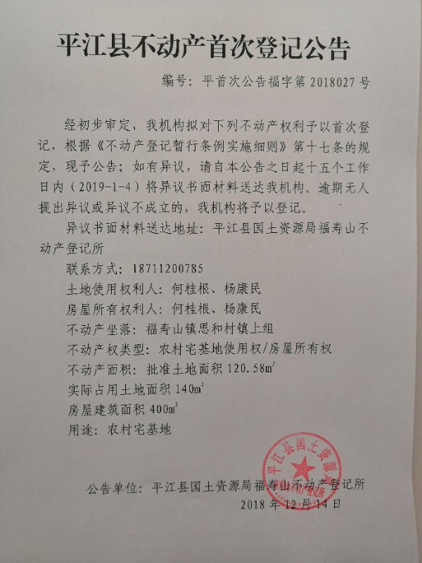 何桂根 杨康民不动产首次登记公告 福字第2018027号