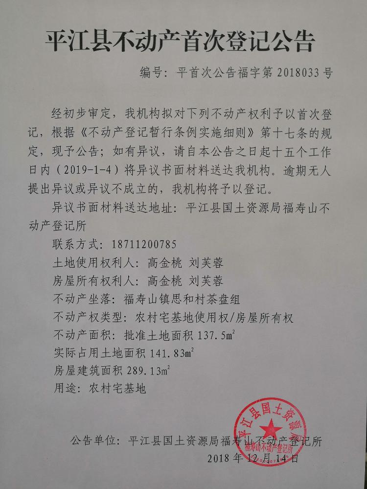 高金桃 刘芙蓉不动产首次登记公告 福字第2018033号