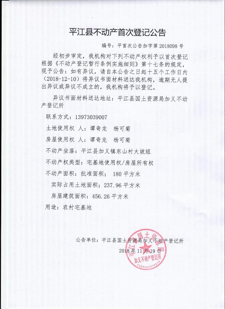 谭奇龙 杨可菊不动产首次登记公告 加字第2018098号