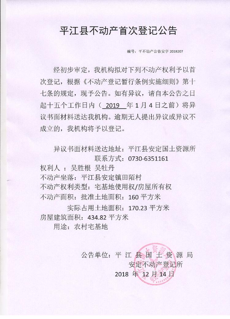 吴胜根 吴牡丹不动产首次登记公告 安字2018207