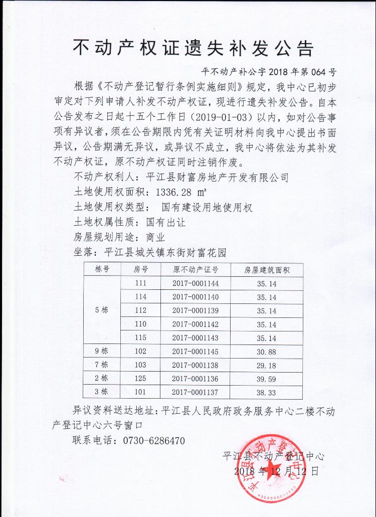 平江县财富房地产开发有限公司不动产权证遗失补发公告平不动产补公字2018年第064号