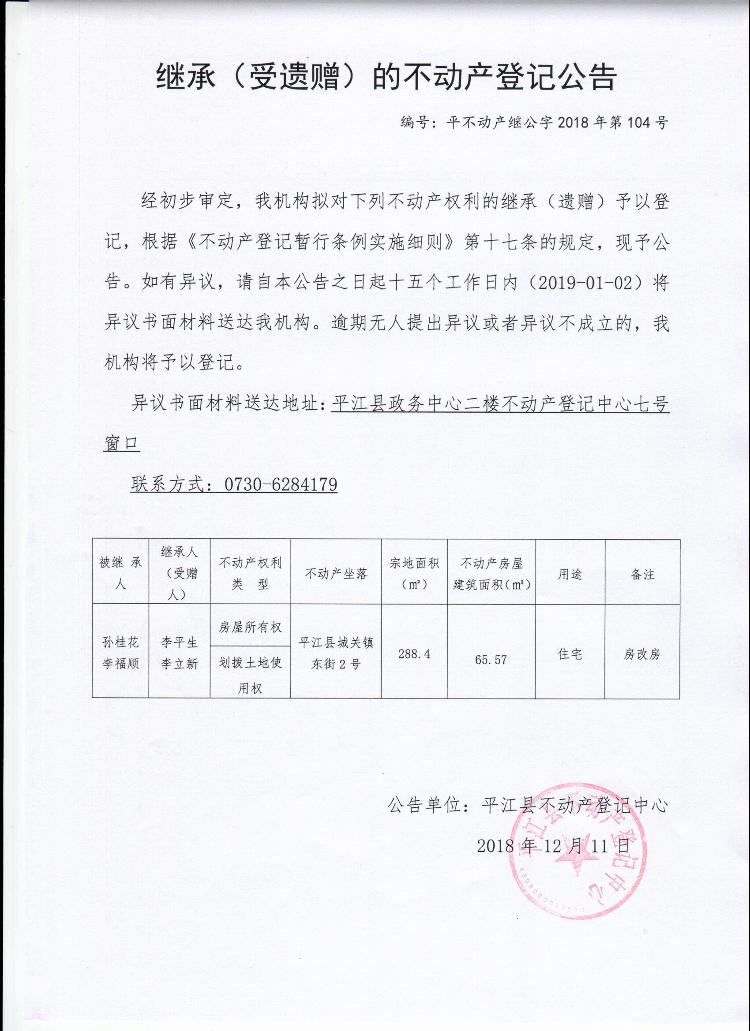 李平生 李立新继承(受遗赠)的不动产登记公告平不动产继公字2018年第104号
