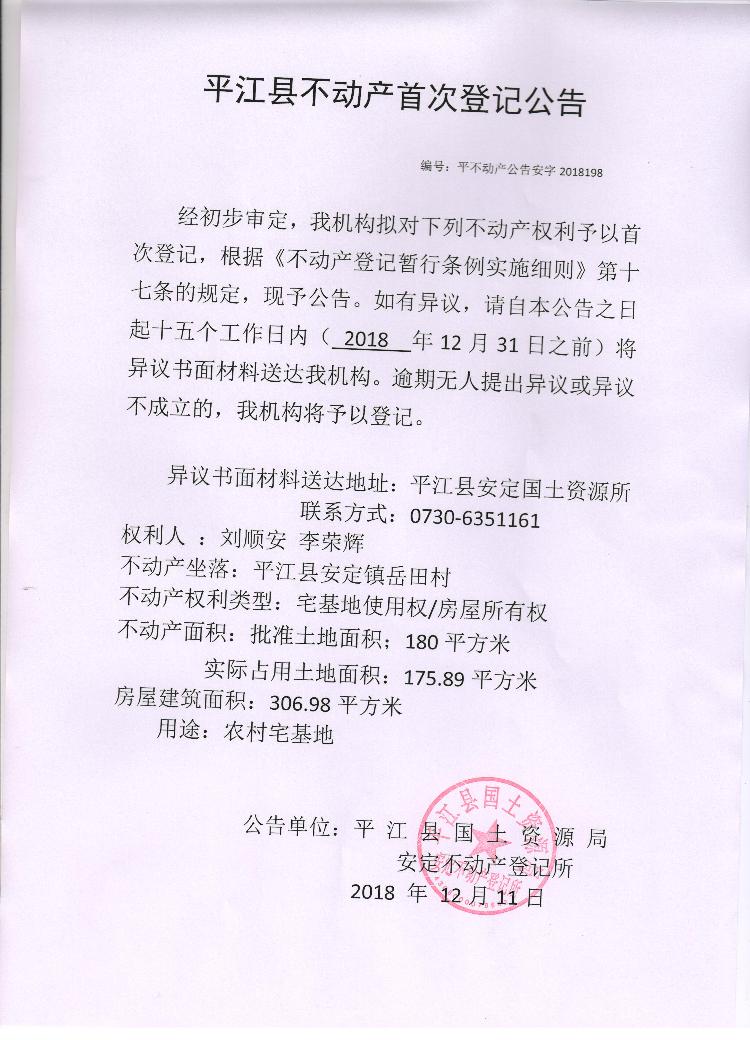 刘顺安 李荣辉不动产首次登记公告 安字2018198
