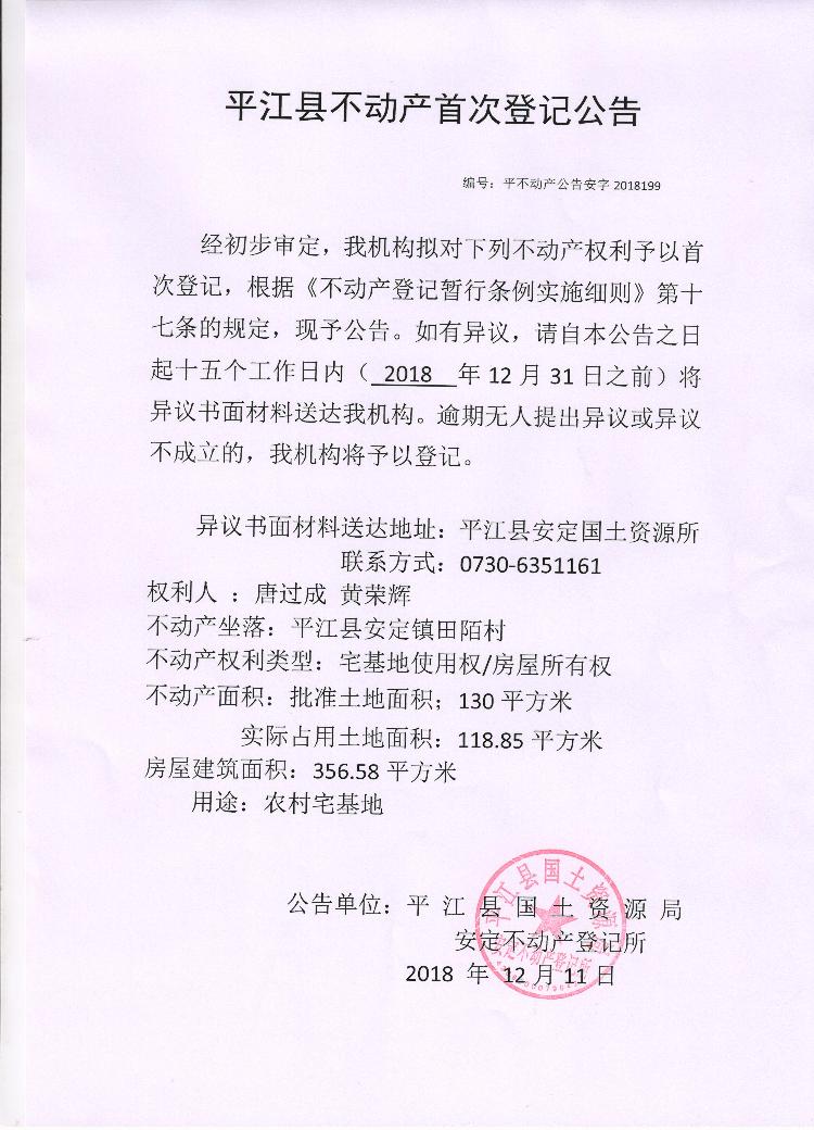 唐过成 黄荣辉不动产首次登记公告 安字2018199