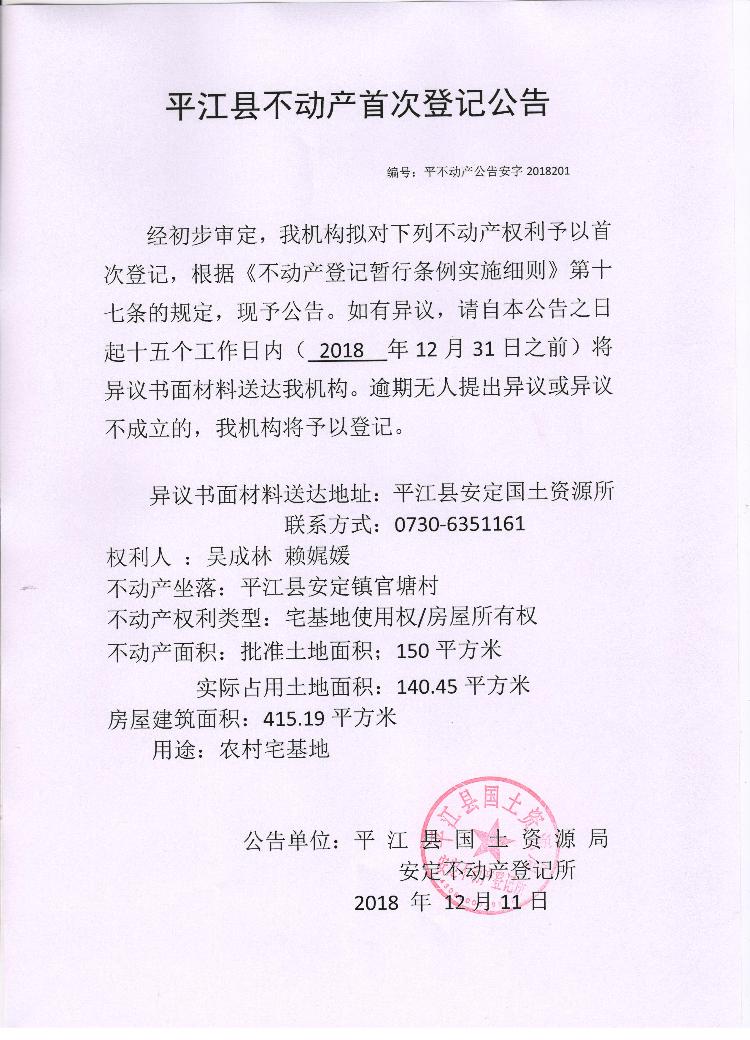 吴成林 赖娓媛不动产首次登记公告 安字2018201