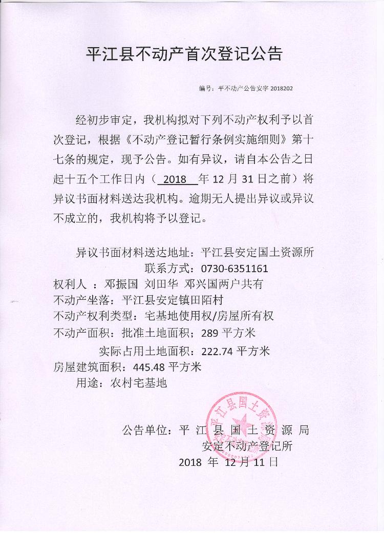 邓振国 刘田华 邓兴国两户不动产首次登记公告 安字2018202