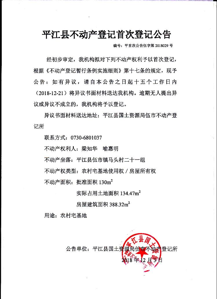 梁知华 喻惠明 不动产首次登记公告 伍字第2018029