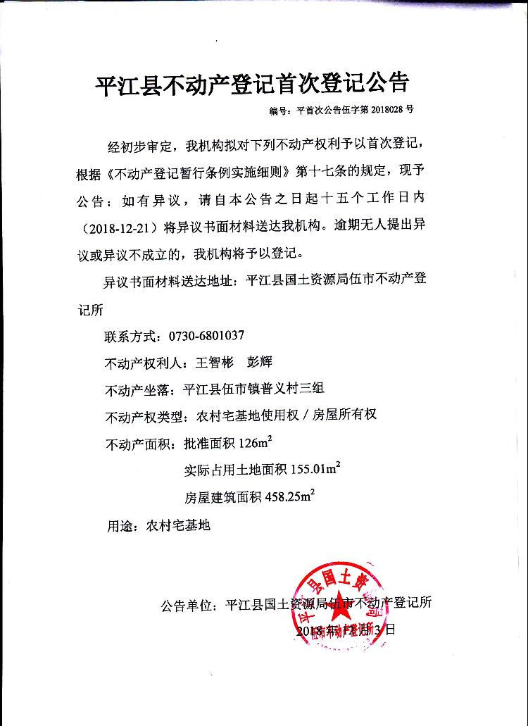 王智彬 彭辉 不动产首次登记公告 伍字第2018028