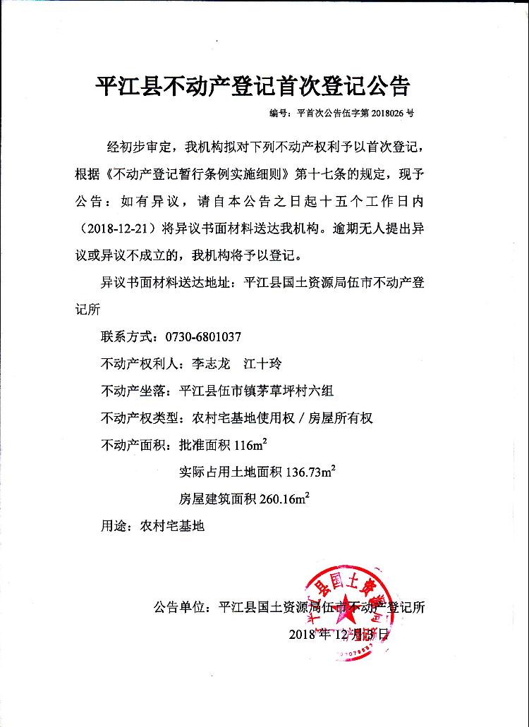 李志龙 江十玲 不动产首次登记公告 伍字第2018026