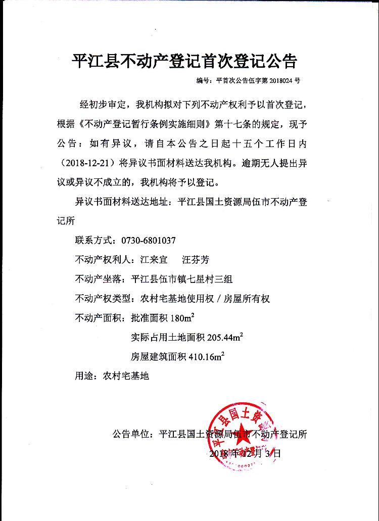 江来宜 汪芬芳 不动产首次登记公告 伍字第2018024