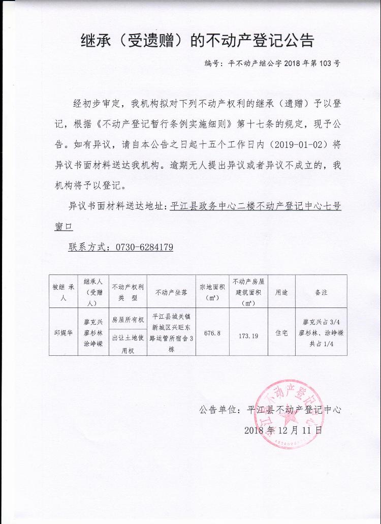 廖克兴 廖杉林 涂峥嵘继承(受遗赠)的不动产登记公告平不动产继公字2018年第103号