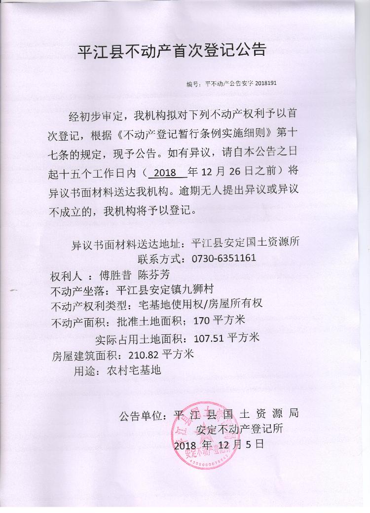 傅胜昔 陈芬芳不动产首次登记公告 安字2018191