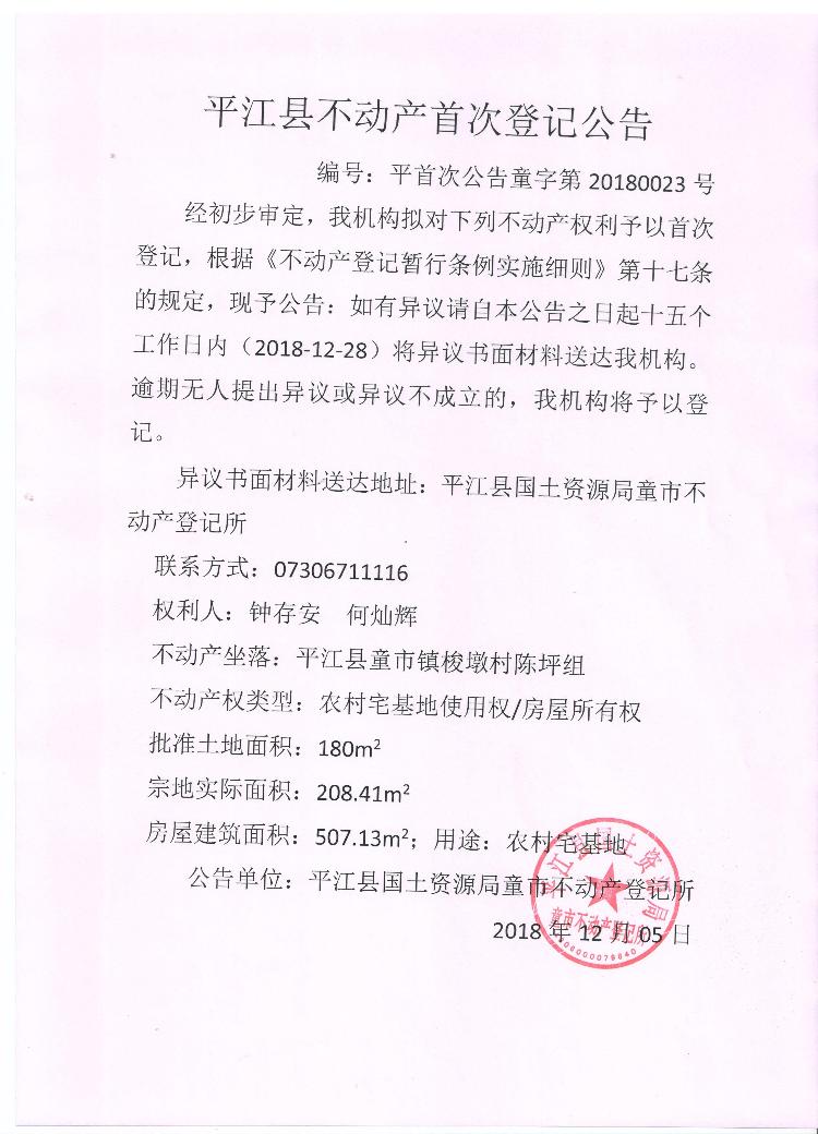 钟存安 何灿辉不动产首次登记公告 童字第20180023号