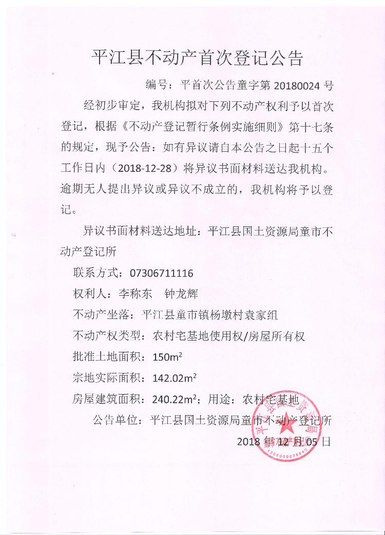 李称东 钟龙辉不动产首次登记公告 童字第20180024号