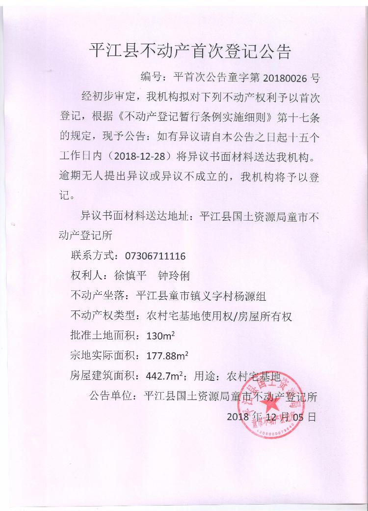 徐慎平 钟玲俐不动产首次登记公告 童字第20180026号