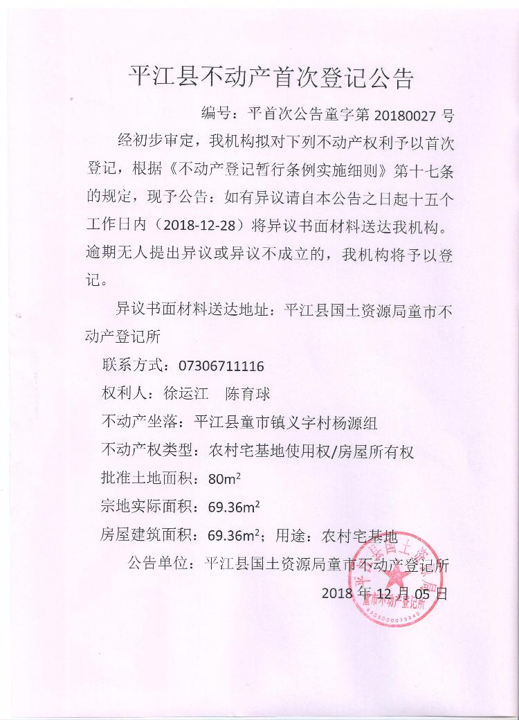 徐运江 陈育球不动产首次登记公告 童字第20180027号
