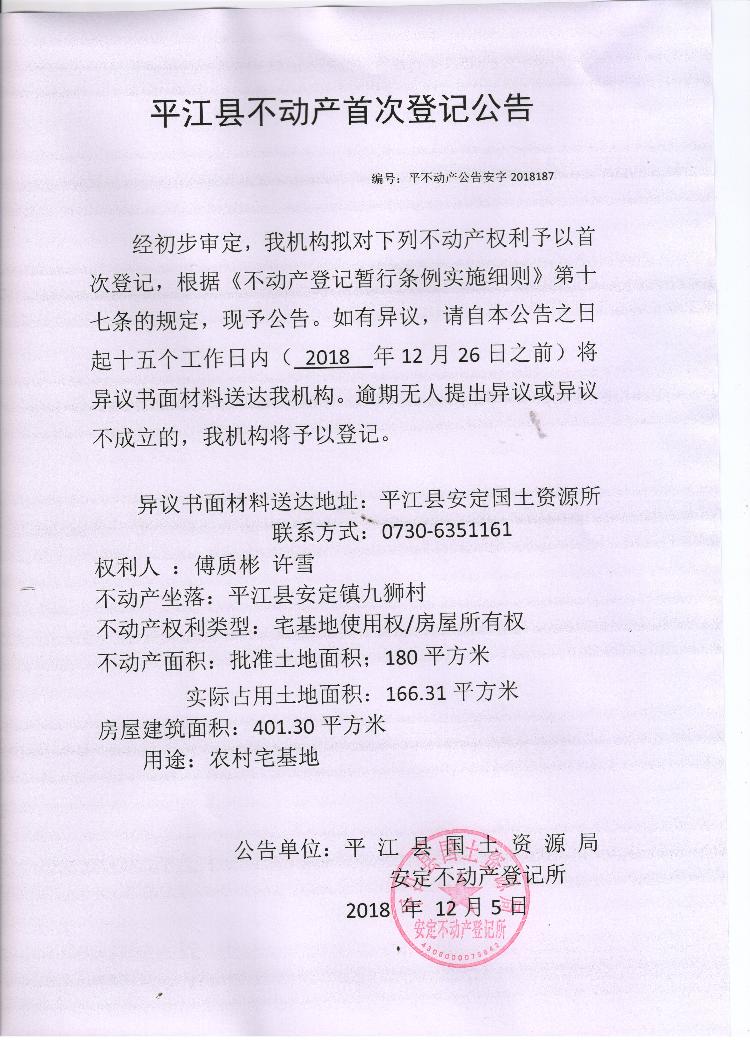 傅质彬 许雪不动产首次登记公告 安字2018187